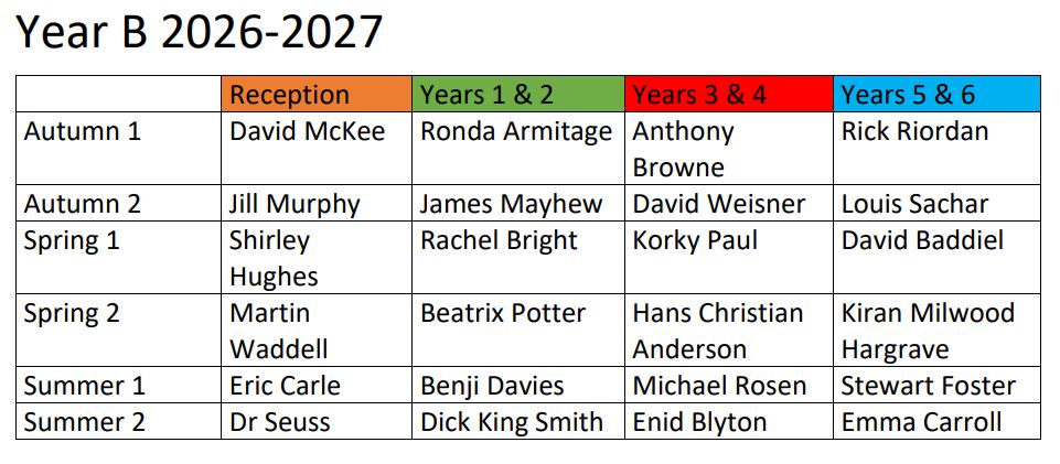 Every half term, we change our focus author, each keystage has a different author and we love reading their books and discovering what they have written.