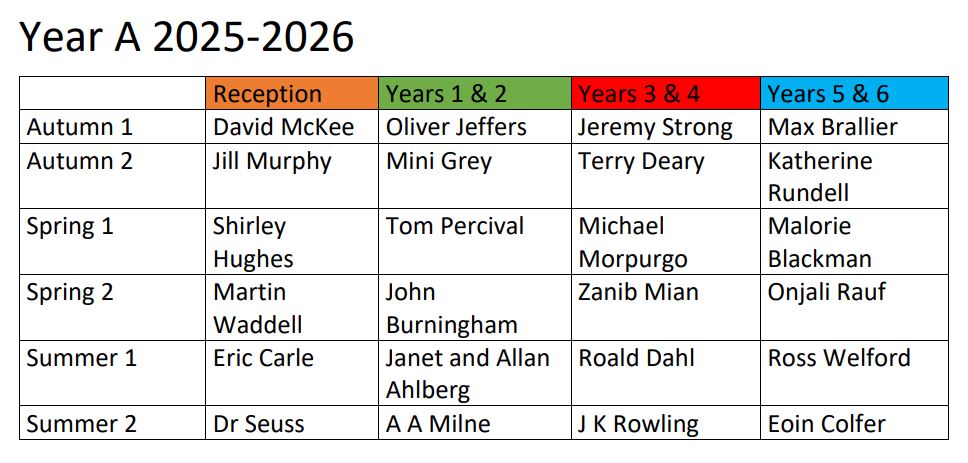 Every half term, we change our focus author, each keystage has a different author and we love reading their books and discovering what they have written.